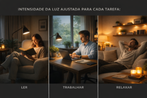 Luminárias inteligentes permitem programar transições suaves de iluminação ao longo do dia, ajudando o corpo a acompanhar o ritmo natural. Essa sincronização contribui para um sono mais reparador e, consequentemente, para melhor equilíbrio emocional.