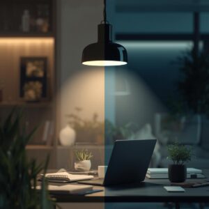 Luz mais fria favorece concentração, enquanto tons quentes criam atmosfera relaxante. Alternar entre essas opções permite adequar o escritório a diferentes momentos do dia.